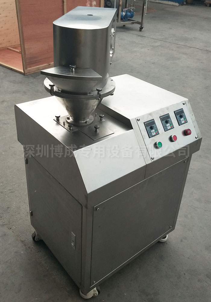 由電機、減速機、變頻器、制粒機構(gòu)和篩網(wǎng)等組成,把壓片部件出來的片狀物料,經(jīng)兩次制粒制成所需的顆粒,上面的制粒采用刀片式,下面的制粒采用特殊的轉(zhuǎn)籠式結(jié)構(gòu),增加顆粒的成品率。顆料大小由網(wǎng)孔的孔徑來控制。篩網(wǎng)可配(ф0.8,ф1.0mm,ф1.2mm,ф1.5mmф2.0mm)